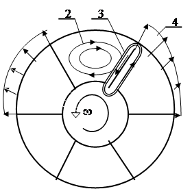 Действительный напор РК - Н РК всегда ниже. чем Н РК,т.∞. по двум основным причинам: 1-наличие гидравлических потерь Δ h РКГ при течении жидкости с объемным расходом Q РК в межлопастном пространстве, 2-влияние конечного числа лопастей – Z. Гидравлические потери РК - Δ h РКГ пропорциональны квадрату подачи и при расчетах обычно учитываются через гидравлический КПД рабочего колеса - ηГрк=0,85 - 0,95. Влияние конечного числа лопастей сводится к тому, что действительное распределение относительных, а, следовательно, и абсолютных скоростей в выходном сечении РК сильно отличается от равномерного (см. рис. 5.1). При отсутствии вращения РК распределение скоростей W 2 по окружности выходного сечения в секторах между выходными кромками лопастей приблизительно равномерное, как это показано на эпюре 1. Вращение РК сопровождается инерционными вихрями 2 в каждом секторе межлопастного пространства. Направление вращения этих вихрей обратное по отношению к ω. Кроме этого, вокруг каждой лопасти существует циркуляционное течение 3, вызываемое разностью давлений по сторонам лопасти. В результате сложения трех перечисленных течений формируется реально существующая эпюра скоростей 4, где величина W 2 в передней части сектора больше, чем в задней. Эти особенности течения учитываются введением поправочного коэффициента μ, являющегося функцией числа лопастей и геометрии РК. В расчетной практике для определения μ на номинальном режиме работы насоса часто используется формула Стодолы: μ =1 - (π U 2 Sinβ2)/ Z С 2 u,