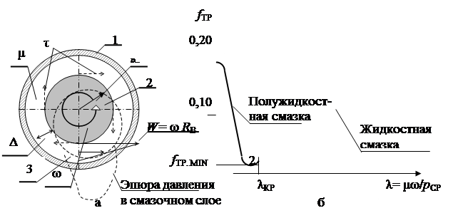 Для герметичных ГЦНПК использование опор скольжения вращающегося ротора зачастую является единственно приемлемым конструктивным решением, обеспечивающим необходимую надежность и долговечность машины. Малые размеры, простота изготовления, бесшумность в работе и другие достоинства опор скольжения при высоких нагрузках и частоте вращения вала могут быть реализованы только при рациональном конструировании, организации смазки и подборе материалов пар трения. Рассмотрим схему действия простейшего подшипника, состоящего из втулки 1, окружающей с зазором Δ вращающийся с угловой скоростью ω вал 2 радиуса RB. Заполняющая зазор жидкость вязкостью μ формирует на поверхности вала тангенциальные усилия τ = μ W / Δ, зависящие от градиента скорости W / Δ, изображенного на рисунке 15.1, а.