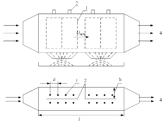 Рис. 1 – высоковольтный электрод (провод);2 – заземленный электрод (осадительный);3 – неочищенный газ;4 – очищенный газ.