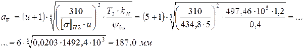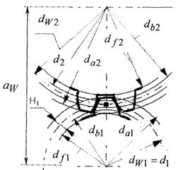 Основные размеры цилиндрических прямозубых передач внешнего зацепления определяются параметрами венца: числом зубьев Z, модулем т, коэффициентом смещения х в соответствии с ГОСТ 13755-81 (СТ СЭВ 308-76). Введем коэффициент, учитывающий динамичность нагрузки и неравномерность зацепления kH = 1,2 и определим межосевое расстояние aW (см. рис. 7) из условия контактной выносливости и выбранного значения коэффициента ширины колеса ψba = 0,4 (рекомендовано [3] в пределах 0,125 – 0,4) по следующей формуле: