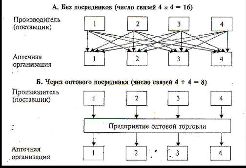 Организация каналов сбыта фармацевтической продукции Существует два основных типа логистических каналов товародвижения: прямые, в которых перемещение товаров от производителя к потребителю осуществляется без посредников, и косвенные, включающие различное число посредников. Количество посредников, участвующих в товародвижении от производителя до конечного потребителя, определяет уровень канала (схема 1). Степень интенсивности сбыта определяется, прежде всего, характером товаров, реализуемых предприятиями, осуществляющими фармацевтическую деятельность. Интенсивный сбыт характерен для лекарственных препаратов безрецептурного отпуска, а также части парафармацевтической продукции. Селективный сбыт предусматривает ограничение числа сбытовых организаций. Это касается товаров, имеющих ограничения при продаже (например, рецептурные лекарственные препараты нельзя реализовать в аптечном киоске; экстемпоральные лекарственные формы изготавливаются только в аптечных организациях, имеющих рецептурно-производственный отдел). Эксклюзивный сбыт имеет место в случае намеренного ограничения числа сбытовых организаций (1-2), участвующих в продвижении товара или товаров. Наличие оптового посредника в системе продвижения товаров аптечного ассортимента от производителя до конечного потребителя объясняется несколькими причинами: · происходит значительное сокращение прямых контактов производителя и потребителя (розничного звена), на организацию которых потребовались бы значительные временные, трудовые и финансовые ресурсы (схема 2); · стирается несоответствие между масштабами производства партий товара и небольшими объемами заказа розничного звена; · появляется возможность поддержания широкого и полного ассортимента при контакте с небольшим числом поставщиков.
