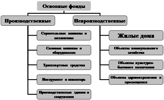 Основные производственные фонды либо непосредственно участвуют в строительном процессе, либо создают условия для него. К основным производственным фондам относятся: