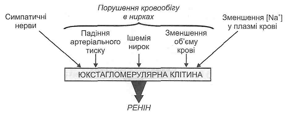 Рис. 75. Фактори — стимулятори секреції альдостерону їхній стимуляційний ефект максимально виявляє себе за умови нормальної секреції ^КТТ'аденогіпофізом. У цьому випадку АКТГ має так звану пермісивну дію. Можлива також безпосередня стимуляція секреції альдостерону високими концентраціями іонів калію в плазмі крові. Гальмують утворення і вивільнення альдостерону в кров передсердний натрійу-ретичний гормон і дофамін. 23.4. Назвіть основні функціональні ефекти альдостерону. Основні функціональні ефекти альдостерону пов'язані з його впливом на нирки. Діючи на дистальні звивисті канальці нефронів, альдостерон викликає: 1) збільшення реабсорбції іонів натрію; 2) збільшення секреції іонів калію; 3) збільшення секреції іонів водню (посилює ацидогенез). 23.5. Що таке ренін-ангіотензинна система? Як вона активується? Назвіть основні функціональні ефекти ангіотензину II і ангіотензину III. Ренін-ангіотензинна система пов'язана з функціонуванням юкстагломеруляр-ного апарату нирок (ЮГА). Цілий ряд факторів (порушення кровообігу в нирках, активація симпатоадреналової системи, зменшення концентрації іонів натрію в плазмі крові) викликає вивільнення клітинами ЮГА в кров протеолітичного ферменту — реніну (рис. 76). Ренін діє на а -глобулін плазми крові (ангіотензиноген) і відщеплює від нього пептид, що складається з десяти амінокислотних залишків. Ця речовина, яка ще не має будь-якої біологічної активності, отримала назву ангіотензин І. При проходженні через капіляри легень від ангіотензину І під впливом ферменту кон-вертази, що міститься на поверхні ендотеліальних клітин, відщеплюється дві амінокислоти, у результаті чого утворюється ангіотензин II. Далі під впливом ангіотен-зиназ утворюються ангіотензин III (складається з 7 амінокислотних залишків) та інші пептиди, що містять 6,5 і менше амінокислот і не мають біологічної активності (рис. 77).