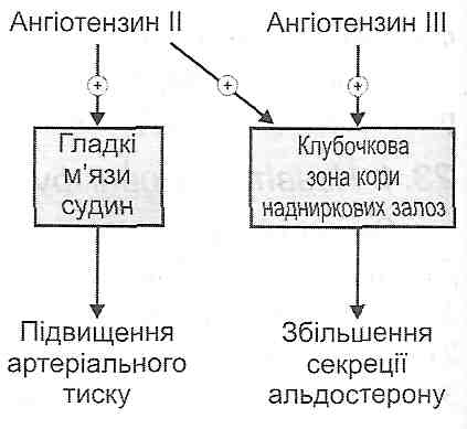 Рис. 74. Класифікація порушень обміну води 23.2. Які гормони беруть участь у захисно-компенсаторних реакціях організму при порушеннях водно-сольового обміну? Альдостерон, вазопресин (антидіуретичний гормон), передсердний натрійуре-тичний гормон (атріопептин), адреналін. 23.3. Які фактори активують і гальмують утворення й секрецію альдостерону? Основним фактором, що стимулює утворення й секрецію альдостерону, є продукти активації ренін-ангіотензинної системи — ангіотензин II і ангіотензин III (рис. 75).