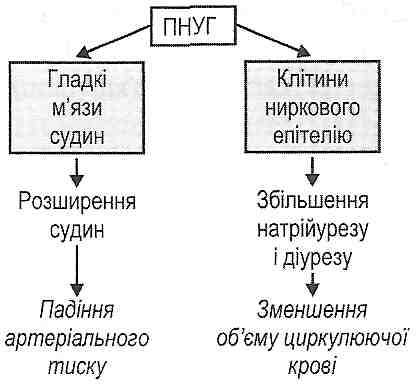 Рис. 78. Функціональні ефекти ангіотензинів II і III Ангіотензин II має два ефекти: 1) викликає скорочення гладких м'язів артеріол, у результаті чого відбувається їх звуження й підвищується артеріальний тиск; 2) діючи на клубочкову зону кори надниркових залоз, він активує секрецію альдостерону. Ангіотензин III має тільки одну з двох зазначених дій - збільшує секрецію альдостерону (рис. 78). 23.6. Які фактори стимулюють утворення й секрецію передсердного натрійуретичного гормону (атріопептину)? Яку дію виявляє цей гормон? Основним фактором, що стимулює утворення й секрецію атріопептину, є збільшення надходження крові в передсердя серця й, зокрема, збільшення об'єму цирку- люючої крові. При цьому відбувається розтягнення стінок передсердь, у результаті чого міоендо-кринні клітини вивільняють гормон у кров. Сьогодні відомо два важливих функціональних ефекти атріопептину. Вони пов'язані з його впливом на клітини канальцевого епітелію нирок і гладкі м'язи судин (рис. 79). Діючи на ці структури, передсердний натрійуретичний гормон, з одного боку, зменшує реабсорбцію іонів натрію, у результаті чого збільшується натрійурез і діурез та зменшується об'єм циркулюючої крові, а з другого - викликає розширення артеріол, унаслідок чого зменшується загальний периферичний опір. У результаті відбувається падіння артеріального тиску.