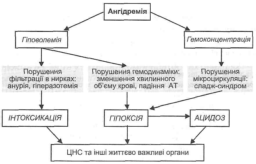 Рис. 82. Патогенез ангідремічного шоку 1) гіповолемія (зменшення об'єму циркулюючої крові). Вона є причиною порушення загальної гемодинаміки. Зменшується хвилинний об'єм крові й артеріальний тиск, що веде до розвитку циркуляторної гіпоксії й метаболічного ацидозу. У результаті гемодинамічних порушень розвивається гостра ниркова недостатність: зменшується фільтраційний тиск і, як наслідок, розвиваються оліго- і анурія, гіпе-разотемія і уремія (інтоксикація); 2) гемоконцентрація (згущення крові, збільшення її в'язкості). Викликає насамперед порушення мікроциркуляції, уповільнюється течія крові в капілярах, розвивається сладж-синдром, істинний капілярний стаз. Наслідком таких розладів є розвиток гіпоксії й ацидозу. Гіпоксія, ацидоз та інтоксикація є основними факторами, що порушують функції ЦНС та інших життєво важливих органів і призводять до смерті. Ознаки важкої ангідремії й смерть настають у дорослих після втрати 1/3, у дітей — 1/5 об'єму позаклітинної рідини. 23.13. Що є причиною внутрішньоклітинного зневоднення? Які зміни в клітинах виникають при цьому? Причиною внутрішньоклітинного зневоднення є збільшення осмотичного тиску міжклітинної рідини, пов'язане з розвитком гіпернатріємії (див. запит. 23.29). У цих умовах вода за законами осмосу виходить із клітин у міжклітинний простір. У результаті зневоднення збільшується внутрішньоклітинна концентрація електролітів, що веде до порушення гідратних оболонок білкових молекул. Зменшується розчинність білків, вони осаджуються, що, в кінцевому підсумку, виявляється порушенням їх функцій. Крім того, зменшення води в клітинах спричиняється до зменшення їхнього об'єму і, як наслідок, до зменшення активної поверхні клітинних мембран. Результатом цього є порушення функцій, пов'язаних із плазматичною мембраною, - міжклітинних взаємодій, сприйняття регуляторних сигналів, міграції та ін. 23.14. Якими порушеннями на рівні організму виявляє себе внутрішньоклітинне зневоднення? Серед загальних порушень на перший план виходять розлади функції нейронів ЦНС. Це виявляється розвитком нестерпної спраги, потьмаренням свідомості, галюцинаціями, порушеннями ритму дихання. Підвищується температура тіла, розвивається "сольова гарячка ". Зневоднення ендотеліальних клітин веде до збільшення проміжків між ними і, як наслідок, до збільшення проникності стінок судин. Це може бути причиною виходу з капілярів у тканини білків плазми крові та її формених елементів — розвиваються геморагії. 23.15. Що таке позаклітинна гіперп'дрія? Назвіть основні її причини. Позаклітинна гіпергідрія — це збільшення об'єму рідини в позаклітинному секторі організму. Вона є результатом позитивного водного балансу. Причинами позаклітинної гіпергідрії можуть бути: I. Надмірне надходження води в організм: а) пиття солоної води, що не вгамовує спрагу; б) внутрішньовенне введення великої кількості рідини хворим. II. Затримка води в організмі внаслідок порушення її виведення нирками: а) ниркова недостатність (оліго- і анурія); б) порушення регуляції нирок (первинний і вторинний гіперальдостеронізм, гіперпродукція антидіуретичного гормону). 23.16. Що таке ізоосмолярна, гіпоосмолярна і гіперосмолярна гіпергідрія? Наведіть приклади. При ізоосмолярній гіпергідрії осмотичний тиск позаклітинної рідини не змінюється. Цей вид порушень мо