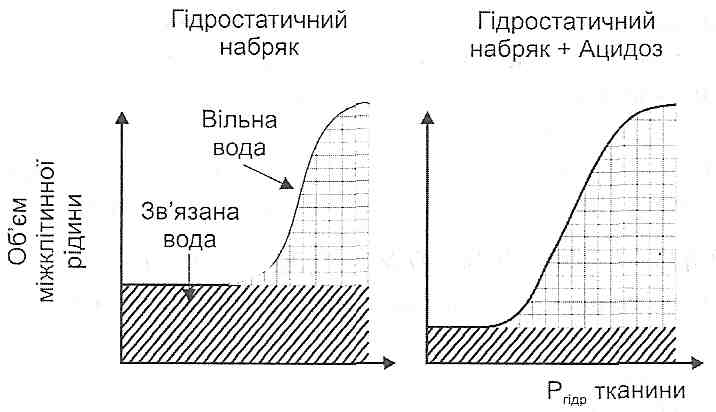 Рис. 83. Вплив ацидозу на розвиток набряків Ацидоз посилює розвиток набряків. Це пов'язане з тим, що при зміщенні рН у кислий бік зменшується гідрофільність структур сполучної тканини. Тому при надходженні води в тканину менша її кількість буде зв'язуватися з тканинними колоїдами і, отже, буде збільшуватися кількість вільної незв'язаної води. У зв'язку з цим за інших рівних умов клінічні ознаки набряку в кислому середовищі будуть більш вираженими (рис. 83). 23.26. У чому сутність дослідів Старлінга, присвячених вивченню патогенезу набряків? Е. Старлінг (1896) у дослідах на жабах вивчав роль онкотичного тиску в розвитку набряків. Він показав, що при пер-фузії жаби фізіологічним розчином, що не містить білка, відбувається швидкий перехід рідини з суцин у тканину, внаслідок чого вода затримується в організмі й маса тварини зростає. Якщо потім перемкнути систему на перфузію сироваткою крові, то буде спостерігатися зворотний процес - рідина виходить із тканин у кровоносні судини й маса жаби поступово віднов- люється до вихідного рівня. Дегідратація тканин відбувається значно повільніше, ніж розвиток набряків. Це пояснюється тим, що вода, яка надійшла в тканину, легко зв'язується із тканинними колоїдами й набагато важче переходить знову у вільний стан.