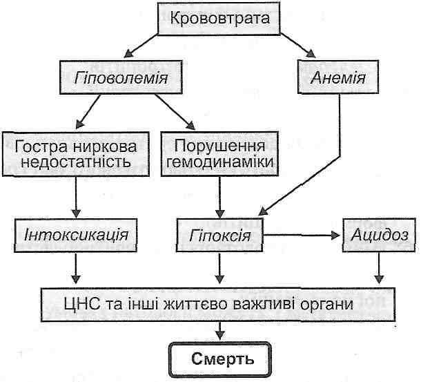 Рис. 94. Головна ланка патогенезу гострої крововтрати 26.8. Які захисно-компенсаторні реакції закономірно розвиваються при крововтраті? Залежно від строків виникнення захисні реакції організму поділяють на термінові і нетермінові. Залежно від спрямованості виділяють такі групи механізмів компенсації: Іо4 спрямовані на зменшення об'єму судинного русла; 2) спрямовані на збільшення об'єму циркулюючої крові; 3) спрямовані на відновлення складу крові; 4) спрямовані на захист від гіпоксії-(див. розд. 19). 26.9. Які компенсаторні реакції організму спрямовані на зменшення об'єму судинного русла в початковій стадії крововтрати? Мета цієї групи реакцій — привести у відповідність об'єм судинного русла зменшеному об'єму циркулюючої крові (централізація кровообігу). Це дає можливість на деякий час підтримати необхідний тиск крові й забезпечити кровопостачання життєво важливих органів. Зазначені реакції- термінові, у їхньому розвитку провідне значення мають рефлекси. Зменшення об'єму судинного русла при крововтраті обумовлюється такими змінами (рис. 95):