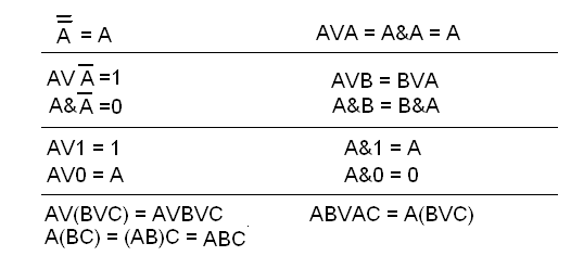 Мы применили здесь известное тождество квадрата суммы и приведение слагаемых с разными знаками. Что же может предложить нам алгебра логики? Наиболее очевидный способ состоит также в последовательном применении к исходному логическому выражению (СДНФ) различных логических тождеств. Этих тождеств существует довольно много, часть из них аналогична законам обычной (классической) алгебры, другие же весьма специфичны. Автор данного пособия не планирует превращать последнее в учебник математической логики, поэтому ниже будут приведены лишь самые основные тождества, без которых, что называется, нельзя жить. Остальные тождества можно найти в более подробной учебной литературе.