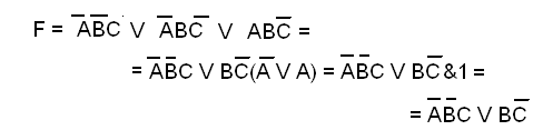 Процесс минимизации состоит в том, что к исходной СДНФ применяются эти и другие подобные тождества до тех пор, пока это возможно. Возьмём, например, ранее рассмотренную функцию (Тема 2) и преобразуем её: