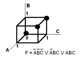 Функция принимает восемь значений – у куба как раз восемь вершин. Каждая вершина изображается либо закрашенным (тёмным) кружком, если соответствующее значение функции равно 1, либо никак не отмечается, если значение равно 0. Соседние вершины, образующие одно ребро, можно склеить, представив это ребро в формуле двучленной конъюнкцией, что равнозначно применению формулы