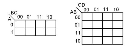 Ещё лучше, если найдутся вершины, образующие целую грань – тогда можно склеить все четыре вершины, представив эту грань в итоговой формуле как одну-единственную переменную (либо её инверсию). Лишь вершины, не имеющие соседей, придётся оставить в таком виде, как они и были – в виде трёхчленных конъюнкций. Существует и модификация этого представления для случая функции четырёх переменных – четырёхмерный гиперкуб, который в данном случае наглядно изображают в виде двух кубов, один из которых «вложен» в другой (находится внутри другого). У такой фигуры 16 вершин, отвечающих 16 значениям функции. Работа с такой фигурой выглядит уже довольно громоздко. Дальнейшее развитие геометрического представления привело к появлению очень удобного метода диаграмм Вейча, или метода карт Карно, основанного на зрительном анализе развёрток многомерных кубов на плоскости, Карта Карно – это плоская таблица из восьми клеток для функции трёх переменных и из шестнадцати клеток – для функции четырёх переменных. Значения нулей и единиц над столбцами и слева от строк здесь располагаются так, чтобы при переходе от строки к строке и от столбца к столбцу всегда изменялось значение только одного разряда: