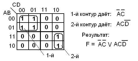 В такую таблицу сначала переносят все значения функции из таблицы истинности (все нули и единицы из столбца F), а затем приступают к построению контуров (обводов) единиц, Единицы, стоящие рядом в количестве 2, 4, или 8 и образующие один вертикальный, один горизонтальный отрезок (прямоугольник) либо квадрат, обводят общим контуром. Одна и та же единица может входить в несколько контуров: