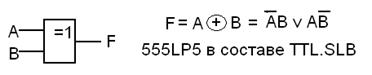 В конструкциях цифровых устройств часто находит применение ещё одна базисная функция, которую в настоящее время можно считать стандартной. Она называется «сумма по модулю 2». В случае двух (и только двух!) аргументов эта же функция именуется «Исключающее ИЛИ», «Неравнозначность», NAND. Таблица истинности этой функции была приведена выше (Тема 1). Название связано с тем, что функция в точности совпадает с результатом арифметического сложения двоичных чисел в пределах одного разряда. Отсюда широкое применение этой функции при построении разного рода счётных и суммирующих устройств, а также устройств контроля правильности передачи данных. Ниже приведено условное изображение элемента, реализующего эту функцию, и её представление в базисе И, ИЛИ, НЕ: