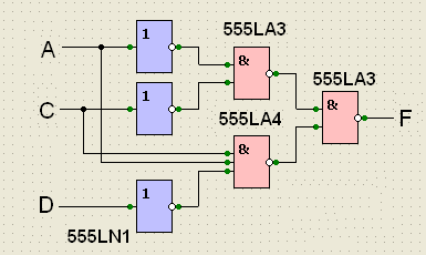 Отметим, что функция после минимизации оказалась не зависящей от переменной В. Эта переменная является в данном случае фиктивным аргументом, то есть не влияет на результат, вырабатываемый функцией. Применяем правила де Моргана таким образом, чтобы перейти от функции ИЛИ к функции И-НЕ, для чего инвертируем каждый из операндов (слагаемых) функции ИЛИ, заменяем ИЛИ на И, после чего инвертируем весь результат. Теперь, пользуясь другим (справочным) методическим пособием, выберем нужные элементы. С инвертором 555LN1 мы уже знакомы. Ещё нам понадобится два двухвходовых элемента И-НЕ (находим, что это 555LA3) и элемент с той же функцией, но тремя входами (это 555LA4). Приступаем к построению схемы: