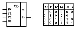 Обсудить с преподавателем вопрос о том, почему вход разрешения D одного из дешифраторов выполнен прямым, а другого (вход E) – инверсным. Объяснить, что происходит на диаграмме (при использовании указанных на рисунке входных сигналов) на 10-м, 20-м и 30-м циклах (периодах сигнала B). Изменить CMD-файл так, чтобы на 35-м цикле работы, не изменяя сигналов D и E, одновременно выключить оба дешифратора. Переделать модель так, чтобы ИМС 555ИД4 работала как один дешифратор «3-8», Наконец, обсудить вопрос о том, почему это устройство называется также демультиплексор (после изучения мультиплексоров). Шифратор – устройство, в определённом смысле противоположное дешифратору. Он имеет 2N входов, N выходов и преобразует сигнал на одном из входов в двоичный код на выходах. Обычно предполагается, что логическая единица может присутствовать ровно на одном из входов. Существуют также устройства, способные выделить и преобразовать в выходной код самую старшую из нескольких единиц, присутствующих во входном наборе. Такой шифратор называют приоритетным. Буквы CD в условном графическом изображении шифратора происходят от слова coder (более правильно: encoder).
