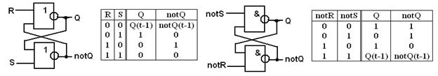 Тема 9, Цифровые устройства с памятью Триггер из двух логических элементов – самое простое устройство, способное запоминать один бит информации, то есть сколь угодно долго находиться в одном из двух возможных состояний. Классические варианты такой схемы строятся либо на элементах ИЛИ-НЕ, либо на элементах И-НЕ и называются RS-триггер (Reset – сброс, Set - установка).