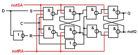 На цепь, помеченную буквой D и содержащую инвертор, сначала не следует обращать внимания. Такой триггер, состоящий из двух ступеней, непрозрачен для входных сигналов ни при C=0, ни при C=1. Здесь предусмотрены входы асинхронной установки в 1 (notSA) и сброса в 0 (notRA) с низким активным уровнем сигнала. Запрещённая комбинация существует и для данного триггера, что будет видно, наряду с другими особенностями поведения, при моделировании: