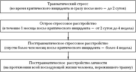 В результате воздействия на личность травмирующего фактора, опасной, экстремальной ситуации может развиваться посттравматическое стрессовое расстройство. Это вторичная, проявляющаяся через определенное время после окончания самой экстремальной ситуации реакция организма на травмирующее событие. ПТСР может иметь затяжной характер и повлиять на всю дальнейшую жизнь человека. Однако посттравматическое стрессовое расстройство возникает далеко не у всех участников той или иной экстремальной ситуации. Это зависит от ряда факторов: • особенностей личности, значимости для человека ситуации; • биопсихических особенностей индивида (особенностей нервной системы, половозрастных особенностей); • опыта нахождения в экстремальной ситуации; • наличия у человека психических травм; • различных форм зависимого поведения или склонности к ним; • отсутствия или наличия поддержки со стороны значимых лиц. Далеко не каждое травмирующее событие может вызвать ПТСР. Выделяют четыре характеристики психической травмы: 1) произошедшее событие осознается, т. е. человек понимает причины своего состояния, помнит само травмирующее событие и видит возможные последствия травмы для себя, своих близких и т. п.; 2) психотравмирующее событие обусловлено внешними обстоятельствами; 3) травмирующая ситуация разрушает привычный для человека уклад жизни; 4) пережитое событие вызывает ужас, ощущение беспомощности, бессилия. Посттравматическое стрессовое расстройство может развиваться вслед за травмирующими событиями, которые выходят за рамки обычного человеческого опыта. К стрессорам, вызывающим ПТСР, относят: стихийные бедствия, техногенные катастрофы, а также события, являющиеся результатом целенаправленной, часто преступной деятельности (диверсии, террористические акты, пытки, массовое насилие, боевые действия, попадание в ситуацию «заложника», разрушение собственного дома и т. п.). ПТСР возникает в том случае, когда стресс превышает психологические, физиологические, адаптационные возможности человека и разрушает защиту. Посттравматическое стрессовое расстройство представляет собой комплекс реакций человека на травму. Под травмой в данном случае понимается переживание, потрясение, которое у большинства людей вызывает страх, ужас, беспомощность. В соответствии с особенностями проявления и течения различают три подвида ПТСР: 1) острое, развивающееся в сроки до трех месяцев; 2) хроническое, имеющее продолжительность более трех месяцев; 3) отсроченное, когда расстройство возникло спустя шесть и более месяцев после травмы. Посттравматическое стрессовое расстройство накладывает отпечаток на всю дальнейшую жизнь человека, поэтому требуется коррекция данного состояния, с тем чтобы сгладить его последствия. Схематически взаимосвязь различных по времени возникновения, продолжительности и глубине стадий формирования постстрессовых нарушений представлена на рисунке 3.