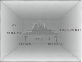 Визуально громкость показывается от переднего плана к заднему, и, когда громкость становится меньше, чем установленный порог, звук исчезает. Если низкоуровневый звук представляет из себя шум, утечку, атаку или релиз – он будет отсечен.