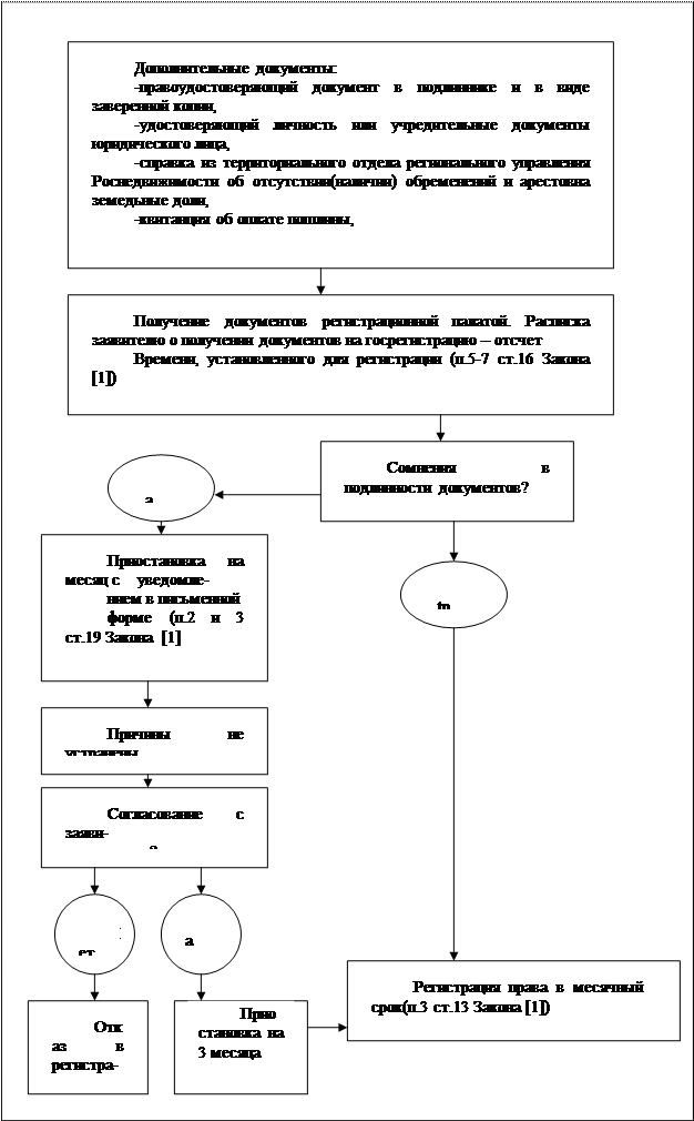 -правоудостоверяющий документ в подлиннике и в виде заверенной копии, -удостоверяющий личность или учредительные документы юридического лица, -справка из территориального отдела регионального управления Роснедвижимости об отсутствии(наличии) обременений и арестов на земельные доли, -квитанция об оплате пошлины. 2. Должностным лицом регистрационной палаты деклается запись в книгу учета документов об их приеме, а заявителю выдается расписка о получении документов. С этого момента ведется отсчет времени, установленного для регистрации (п.5-7 ст.16 Закона [1]). 3.Регистрация проводится в месячный срок (п.3 ст.13 Закона [1]). 3.1. При возникновении у регистратора сомнений в подлинности документов он в праве (но это не обязанность)приостановить регистрацию на1 месяц с обоснованным (п.2 и 3 ст.19 Закона [1]) уведомлением в письменной форме заявителя. 3.2. Если в указанный срок заявитель не устранит причины, препятствующие регистрации, то регистратор вправе отказать в регистрации. По письменному согласованию с заявителем срок приостановки регистрации может быть продлен н 3 месяца(п.2 и 3 ст.19 Закона [1]). 4. По результатам регистрации заявителю выдается: - выписка из ЕГРП, - Свидетельство о праве собственности по форме, утвержденной Постановлением Правительства РФ от 18февраля 1998г., №219. На основе этих документов собственник вправе совершать с долей любую сделку, предусмотренную ст.12 Федерального закона «Об обороте земель сельскохозяйственного назначения».