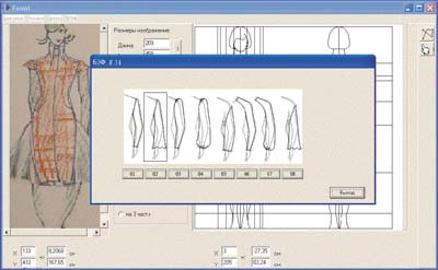 Программный комплекс предполагает возможность сравнения стилизованного изображения эскиза с пропорциональным графическим отображением фигуры человека с помощью сетки. Распознавание графического образа модели на втором этапе осуществляется посредством выбора эталонных форм элементов одежды из диалогового окна (рис. 4).