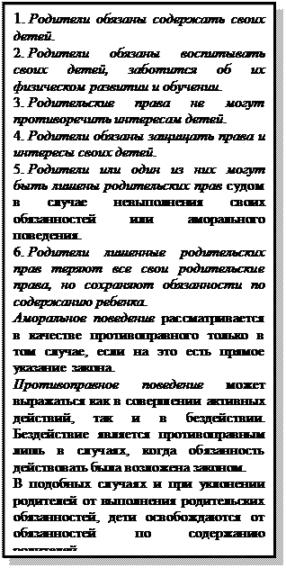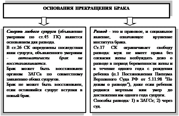 Законодательство не содержит легального определения брака. Отечественная доктрина семейного права тяготеет к следующему определению брака: брак – это свободный равноправный союз мужчины и женщины, заключенный с соблюдением порядка и условий, установленных законом, имеющий целью создание семьи и порождающий между супругами взаимные личные и имущественные права и обязанности. Семья – это круг лиц, связанный между собой правами и обязанностями, вытекающими из брака, родства, свойства, усыновления или иной формы принятия детей на воспитани е. Семейные отношения регулируются целой системой законодательных актов, круг которых определен в ст. 2 Семейного кодекса РФ. К ним относятся: Семейный кодекс РФ от 29 декабря 1995 г., Гражданский кодекс РФ часть1 и часть3. Кроме того, вопросы брака и семьи конкретизируются в ряде федеральных законов, постановлений Правительства, ведомственных инструкций и др. На требования, вытекающие из семейных правоотношений, исковая давность не распространяется. В качестве исключения в СК РФ предусмотрены, например, следующие сроки исковой давности: · трехлетний срок исковой давности к требованиям супругов о разделе общего имущества супругов, брак которых расторгнут (7 ст.42); · трехлетний срок исковой давности – для взыскания алиментов за прошлое время при условии, что истец принимал меры к получению средств на содержание, но алименты не были получены вследствие уклонения лица, обязанного уплачивать алименты, от их уплаты (п. 2 ст. 107). В нашей стране защищается только зарегистрированный брак. Вопросы регистрации брака отражены в ФЗ "Об актах гражданского состояния" от 15 ноября 1997г. Жених и невеста подают совместное заявление с просьбой о регистрации брака. Брак регистрируется по истечении одного месяца со дня подачи заявления (возможность проверить чувства). По просьбе жениха и невесты при наличии уважительных причин этот срок может быть увеличен заведующим ЗАГСом не более чем на 1 месяц. Если 2 месяца не хватило, необходимо подать новое заявление. По просьбе жениха и невесты заведующий ЗАГСом может сократить срок (СК не говорит, на сколько) (ст. 11 СК). Можно зарегистрировать брак в день подачи заявления, но только при наличии исключительных (особых) обстоятельств (ст.11 СК): 1) беременность, 2) рождение ребенка, 3) непосредственная угроза жизни одной из сторон, 4) другие обстоятельства. Только действительный брак порождает те правовые последствия, к которым стремятся его участники (супруги), а действительным брак будет, если соблюдены все позитивные и негативные условия его действительности. Позитивные условия - это условия, которые должны присутствовать в момент регистрации брака. Негативные условия - отсутствовать (это обстоятельства, препятствующие заключению брака). К позитивным условиям относятся (ст.12 СК): взаимное согласие лиц, вступающих в брак; достижение брачного возраста. 1. Взаимное согласие лиц, вступающих в брак - это согласование воль, свободное от пороков воли. Нельзя заключать брак под угрозой, путем обмана, путем намеренного введения лица в заблуждение. Выявление истинной воли лиц, вступающих в брак: · в момент совместной подачи заявления - это подтверждение воли обеих сторон желания вступить в брак. В случае если один из вступающих в брак не может физически присутствовать при подаче заявлени