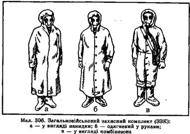 Загальновійськовий захисний комплект (ЗЗК) складається із захисного плаща з капюшоном, захисних пан-чох і рукавиць. Плащі випускаються п'яти розмірів: 1-й — для людей зростом до 165 см, 2-й — від 165 до 170 см, 3-й — від 171 до 175 см, 4-й — від 176 до 180 см, 5-й — вище 180 см. Підошва захисних панчох має гумову основу. Панчохи надівають поверх звичайного взуття і прикріплюють до ніг хлястиками і шпениками, а до поясного паска — тасьмою. ЗЗК можна носити як накидку та одягати у рукави, як комбінезон.