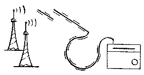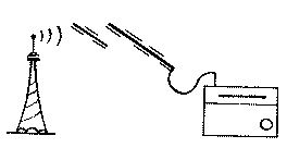 Но в проводе есть колебания от разных станций. Как слушать одну? Колебания подают сначала на колебательный контур с собственной частотой колебаний... (На месте колебательного контура — а предполагается, что мы не знаем, что это такое — рисуем любую загогулинку и говорим себе: это колебательный контур!)