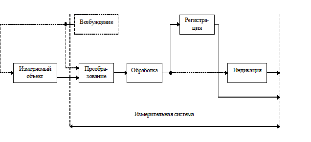 Определим структуру измерительной системы. Очевидно, что наиболее удобным являются передача и обработка элементов сигнала. В том случае, если измеряемый объект сам порождает электрический сигнал, то нам остается только преобразовать его. В том случае, если мы измеряем физическую величину не электрической природы, то необходимо создать датчик, преобразующий эту физическую величину в электрический сигнал. Информация, которую мы хотим получить от измеряемого объекта не всегда имеет форму активной информации. В тех случаях, когда измеряемая величина не является активной, необходимо воспользоваться источником возбуждения, который будет оказывать воздействие на измеряемый объект. Тогда отклик объекта (вместе с самим воздействием) будет содержать желаемую информацию. Если же измеряемый объект сам порождает сигнал, уже содержащий желаемую информацию, то во внешнем возбуждения нет надобности. Таким образом, обобщенную модель измерительной системы можно представить как
