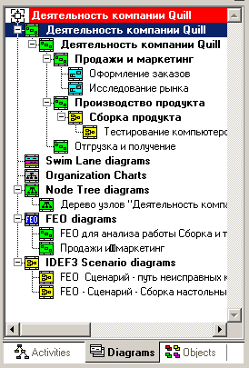 Закладка Diagrams (рис. 5) отображает иерархию диаграмм модели, служит для быстрого перехода к любой диаграмме модели, включая Organization Chart, Node Tree, Swim Lane, FEO, и IDEF3 Scenario, о которых речь пойдет позже.