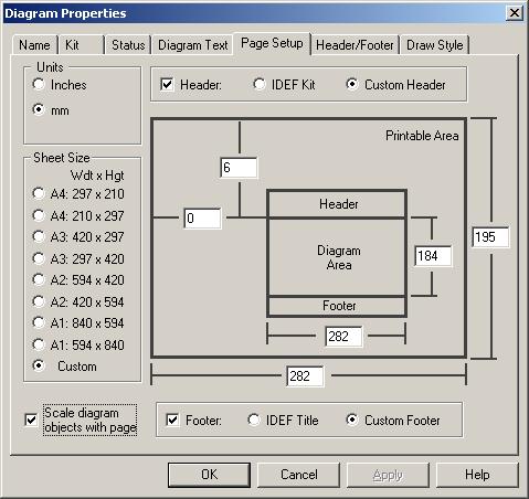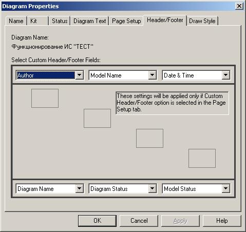Рис. 8. При необходимости в AllFusion PM можно изменить стандартный бланк диаграммы: удалить верхнюю и/или нижнюю область бланка или создать собственный бланк. В этих целях используют закладки Page Setup и Header/Footer диалога Diagram Properties (меню Diagram/Diagram Properties) (рис. 9,10). Контрольные вопросы: 1. Дайте характеристику пользовательского интерфейса приложения AllFusion PM. 2. Как русифицировать рамку диаграмм в AllFusion PM? 3. Как русифицировать тексты, вводимые пользователем в AllFusion PM? 4. Опишите структуру навигатора моделей (Model Explorer). 5. Какие операции можно выполнять с помощью навигатора моделей? 6. Дайте характеристику полям стандартного бланка диаграммы.