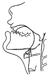 Рентгеновские лучи проникают через мягкие ткани хотя и сохраняют их в виде мягких контуров (губы, тело языка мягкое небо); костные и хрящевые органы вырисовываются более отчетливо. Для уточнения контуров необходимо наносить раствором бария мазок на губы (если губная артикуляция является объектом исследования) и ленточку (типа стоп-линий) по центру спинки языка (покрытие всей поверхности языка раствором бария не содействует четкости результатов). Рентгеносъемку может производить сам испытуемый нажимая на кнопку и предварительно приблизив щеку к вертикально закрепленной кассете. Рентгенограмму затем схематически перерисовывают тушью на целлулоид (сохраняя то, что нужно для данного эксперимен тального материала и опуская то, что не нужно) или другой прозрачный материал (для этого можно использовать рентгенопленку со смытой эмульсией). Схема позволяет делать любые промеры и отсчеты (см. рис. 7).
