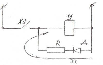 В схеме 2после размыкания контакта Х1, уменьшающийся магнитный поток наводит ЭДС в катушке реле У, поэтому протекающий ток Ук удерживает якорь в притянутом состоянии. Эти схемы характеризуются дополнительными потерями мощности, возникающие в резисторе R. Схема 3,4 лишена указанного недостатка, где в последовательность резистора включен диод (Д), поэтому в стационарном режиме ток через резистор не протекает для получения значительной выдержки, реле обычно очень массивны для того, чтобы обеспечить необходимый запас энергии.