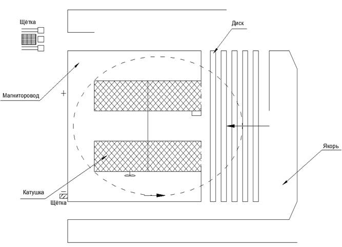 В корпусе размещена намагничивающая катушка, Другой зажим подключают к корпусу муфты. При включении муфты, магнитный поток, создаваемый катушкой проходит через пакет внутренних и наружных дисков и замыкается через якорь. Якорь притягивается и сжимает диски. Начинается вращение второго вала, т.е. муфта передает крутящий момент. Все детали муфты монтируют на втулке, которая устанавливается на валу. Внутренние диски передвигаются по шлицам втулки, наружные диски снабжены пазами, которые служат для соединения между собой. Отключение муфты происходит после снятия V с катушки и за счёт! щих волнистую форму. Для надёжности работы муфты имеют const-ю смазку. Диски изготовляют из специальной стали с малым магнитным сопротивлением, с малой остаточной индуктивностью и высокой износостойкостью. Кроме рассмотренных муфт, имеются муфты, работающие в сухую(это муфты с вынесенными дисками). Имеются и муфты без контактные, в которых намагничивающая катушка расположена на неподвижной части корпуса. Корпус отделён от вращающейся части 2-мя воздушными зазорами. Эта муфта не имеет счётного узла. Недостаток муфты: повышенная намагничивающая усиленность срабатывания.