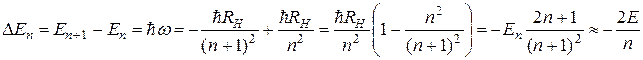 Из сравнения этих двух формул следует, что радиусы орбит должны принимать дискретный ряд значений. Необходимо было сформулировать правило квантования орбит. Для этого Н.Бор придумал принцип соответствия. Бор предположил, что для больших значений n (когда уровни энергии становятся очень близкими друг к другу, а частота излучения малой) результаты даваемые классической и квантовой теорией должны совпадать. Так было, например, в теории М.Планка для равновесного теплового излучения. В частности частота излучения, рассчитываемая классическим и квантовым способом должна быть одинаковой. По классическим представлениям частота излучения должна совпадать с угловой скоростью вращения электрона. Из второго закона Ньютона