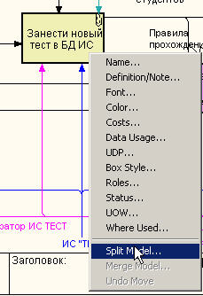 Для расщепления модели следует щелкнуть правой клавишей мышки по работе, имеющей диаграмму декомпозиции, и в контекстном меню выбрать пункт Split Model (рис. 71). В появившемся диалоге Split Options следует указать имя создаваемой (отщепляемой) модели. В результате расщепления в старой модели работа станет недекомпозированной, у работы появится стрелка вызова, причем имя стрелки вызова будет совпадать с именем новой модели (рис. 72). Кроме этого будет создана новая модель, причем имя контекстной работы будет совпадать с именем работы, от которой была «отщеплена» декомпозиция (рис. 73). В новую отщепленную модель можно скопировать словари из исходно модели, что избавляет от повторного ввода информации.