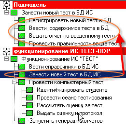 Рис. 74. Рис. 75. На рис. 74 и 75 показано состояние навигатора модели Model Explorer до и после расщепления модели «Функционирование ИС ТЕСТ». Из рисунка видно, что до расщепления в AllFusion PM была загружена лишь одна модель «Функционирование ИС ТЕСТ», причем работа «Занести новый тест в БД ИС» имела декомпозицию. После расщепления в исходной модели работа «Занести новый тест в БД ИС» уже без декомпозиции. Вместе с тем в верхней части навигатора появилась новая модель с именем «Подмодель», причем имя ее контекстной работы совпадать с именем работы «Занести новый тест в БД ИС» совпадает с именем работы, от которой была «отщеплена» декомпозиция.