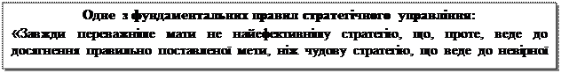Сформульовані цілі підприємства повинні відповідати певним вимогам: · повинні бути адаптивними, тобто повинні переглядатися в зв'язку зі змінами в зовнішньому і внутрішньому середовищі підприємства; · повинні бути конкретними і кількісно вимірними; · орієнтованими в часі (стратегічні цілі розраховані на 2-5 років, тактичні на 1-2 року, оперативні цілі – до 1 року); · реально досяжними і збалансованими з можливостями підприємства; · взаємопогоджуваними і взаємопідтримуючими, тобто дії по досягненню однієї стратегічної мети не повинні перешкоджати досягненню іншої. Правила формулювання стратегічних цілей: 1. Стратегічні цілі повинні починатися з дієслова невизначеної форми в наказовому нахиленні (розробити, поліпшити, довести, підвищити). 2. Необхідно обмовляти тільки «коли» і «що» повинно бути зроблено, не вдаючись у деталі «чому» і «як» це повинно бути зроблено. 3. Стратегічна мета повинна бути затверджена як управлінське рішення і зафіксована письмово в якому-небудь документі, доведена до виконавця. Зв'язок між стратегічними цілями може бути комплементарним, індифирентним і конфліктним. Комплементарний зв'язок означає, що досягнення однієї мети буде сприяти досягненню іншої. Наприклад, збільшення обсягу продажу буде сприяти збільшенню прибутку підприємства; підвищення конкурентоспроможності товарів буде сприяти збільшенню обсягу збуту підприємства. Індифирентний зв'язок означає, що досягнення однієї стратегічної мети ніяк не впливає на досягнення іншої мети. Наприклад, збільшення продуктивності праці не зробить ніякого впливу на зміну структури капіталу підприємства. Конфліктний зв'язок виявляється в тому, що досягнення однієї стратегічної мети утрудняє досягнення іншої. Наприклад, підтримка товарних запасів на рівні 1% від обсягу продажу не зможе забезпечити виконання замовлень у 2-х тижневий термін. Задача менеджера – не допускати виникнення конфліктних зв'язків між стратегічними цілями підприємства. Ефективність досягнення цілей підприємства залежить від того: · наскільки обґрунтовано вони сформульовані; · як широко і повно про них проінформований персонал; · як організоване стимулювання їхнього практичного здійснення.