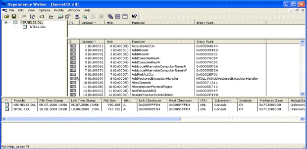 При вызове приложением одной из Win32-функций dll-подсистем может возникнуть одна из трех ситуаций. · Функция полностью выполняется внутри данной dll (шаг 1). · Для выполнения функции привлекается сервер csrss, для чего ему посылается сообщение (шаг 2a, за которым обычно следуют шаги 2b и 2c). · Данный вызов транслируется в системный сервис (системный вызов), который обычно обрабатывается в модуле ntdll.dll (шаги 3a и 3b). Например, Win32-функция ReadFile выполняется с помощью недокументированного сервиса NtReadFile. Некоторые функции (например, CreateProcess) требуют выполнения обоих последних пунктов. В первых версиях ОС Windows практически все вызовы Win32 API выполнялись, следуя маршруту 2 (2a, 2b, 2c). После того, как существенная часть кода системы для увеличения производительности была перенесена в ядро (начиная с Windows NT 4.0), вызовы Win32 API, как правило, идут напрямую по 3-му (3a, 3b) пути, минуя подсистему окружения Win32. В настоящее время лишь небольшое число вызовов выполняется по длинному 2-му маршруту. Помимо перечисленных, наиболее важных dll-библиотек, в системном каталоге system32 имеется большое количество других dll-файлов. В настоящее время количество вызовов API составляет несколько десятков тысяч. Список экспортируемых каждой конкретной dll функций можно посмотреть с помощью утилиты depends, входящей в пакет Platform SDK. Так, на приведена информация о структуре библиотеки kernel32.dll ОС Windows XP, экспортирующей 949 функций.