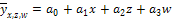 Мұнда х пен z- факторлық белгілер; а 0, а 1, а 2 - теңдеу параметрлері. Егер факторлар үш белгімен берілетін болса { х, z, w),онда сызықтық теңдеудің түрі мынандай болады: