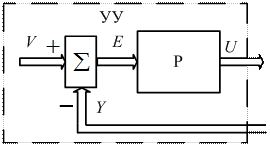 Схематично устройство сравнения (сумматор) будем обозначать в виде прямоугольника со знаком суммирования внутри и при помощи знаков «+» и «–» указывать знак поступающей величины. Тогда на рис. 1.7 алгоритм работы устройства сравнения будет иметь вид E = V – Y, а сигнал e, характеризующий отклонение выходного сигнала Y от входного сигнала V, будем называть сигналом ошибки (сигнал рассогласования, ошибка). При таком представлении управляющего устройства система управления, построенная по принципу обратной связи, будет иметь вид, изображенный на рис. 1.8.