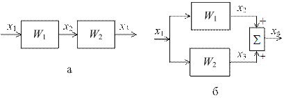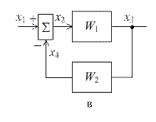 На структурных схемах сигналы следует рассматривать как изображения по Лапласу соответствующих переменных. Рассмотрим преобразование произвольной структуры к стандартному виду, которое осуществляется на основании правил структурных преобразований. Анализ структур систем автоматического управления показывает, что существует три основных вида соединения звеньев: последовательное, паpaллельноe и соeдинениe с помощью обратной связи. Структурные схемы, соответствующие указанным типам соединений, представлены на рис. 3.2, a, б, в.