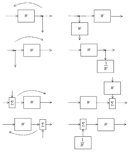 Отметим, что в дальнейшем, если это ясно из контекста, символ s в записи передаточных функций будем иногда опускать. Рассмотрим задачу объединения звеньев в одно звено, связывающее непосредственно вход и выход соответствующего соединения. Для последовательного соединения (см. рис. 3.2, а) можно записать: Для параллельного соединения (см. рис. 3.2, б) уравнения, связывающие координаты, имеют вид Уравнения, связывающие переменные при соединении звеньев с помощью обратной связи (см. рис. 3.2, в), имеют вид Если звенья соединены с помощью положительной обратной связи, то Наряду с объединением звеньев при структурных преобразованиях приходится прибегать к переносу отдельных узлов или сумматоров из одних участков структурной схемы в другие. Такие переносы изображены на рис. 3.3,