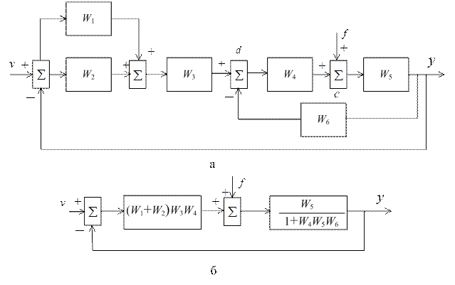 На практике существует и другая задача – расчленения отдельного звена на более простые. Примером решения такой задачи может служить представление передаточной функции звена в виде суммы или произведения передаточных функций элементарных звеньев. Пример 3.1. Рассмотрим систему управления, структурная схема которой представлена на рис. 3.4, a. Последовательность преобразования структуры следующая: переносим сумматор d через звено