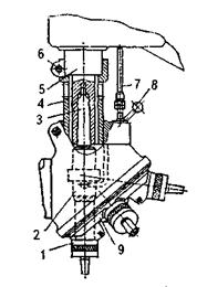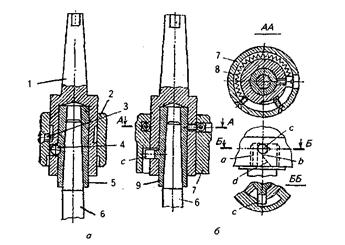 Як відомо, вертикально-свердлильні верстати мають значні переваги над горизонтально-свердлильними, тому розглянемо конструктивні схеми допоміжних пристроїв та інструментів тільки для них. Швидкозамінний патрон для закріплення та заміни різальних інструментів (свердел, зенкерів, розвертачок, цекувачів, мітчиків) під час обертання шпинделя зображено на рисунок 11.1, а. Крутний момент від шпинделя до змінного інструмента 6 передається за допомогою конуса 1, кульки 4 та втулки 5, що має самогальмівне припасування зі змінним інструментом і спеціальну западину для кульки 4. Втулка 2 має вільне припасуваня (з гарантованим проміжком) з конусом 1 і зафіксована на ньому за допомогою контруваль-ного гвинта 3. Для заміни різального інструмента піднімають втулку 2 у верхнє положення. Дією відцентрової сили кулька 4 із западини на втулці 5 переміщується у внутрішнє виточення втулки 2. Від'єднаний від корпуса патрона інструмент можна легко виймати разом зі втулкою 5. Після встановлення нового різального інструмента з насадженою на нього втулкою 5 втулку 2 опускають у нижнє положення, а кулька 4 входить у западину втулки 5 і знову фіксує інструмент на шпинделі верстата. Такі патрони цілком безпечні для роботи зі шпинделями з кутовою швидкістю обертання до 5с-1 (300 об/хв). В іншій конструкції швидкозамінного патрона (рисунок 11.1, б) для заміни різального інструмента 6 достатньо легко загальмувати від обертання втулку 7. Це зумовлює таке збільшення проміжку між упорами а корпуса патрона та внутрішнім скосом b втулки 9, що виступ с інструмента уже не затримується цим скосом, інструмент випадає. Під час встановлення нового різального інструмента з насадженою на нього втулкою 9 виступ с на цій втулці натискає на скіс d втулки 7 і, переборюючи дію пружини 8, повертає її на потрібний кут, а фіксатор закріплює різальний інструмент. Корпус багатошпиндельної револьверної головки закріплений на шпиндельній гільзі 5 верстата за допомогою розтруба 4 та стяжного гвинта 6 (рисунок 11.2). У корпусі головки є нахилений обертовий диск 9, у гніздах якого встановлені шпинделі 1. Диск закріплюється у заданих положеннях за допомогою фіксатора. Центральний вал 3 головки з'єднаний зі шпинделем верстата за допомогою конусного хвостовика.