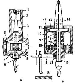 Це відбувається після піднімання шпинделя верстата у верхнє положення. Штовхан 7, впираючись у корпус шпинделььної бабки, вмикає спеціальний механізм (на рисунок 11.2 не зображений), що обертає диск револьверної головки тільки в один бік до наступного положення фіксуваль-ної втулки. Після опускання шпинделя диск головки фіксується у новому положенні, а муфта з'єднує вал 3 з новим шпинделем головки. Ручне обертання диска здійснюється за допомогою ручки 8. Такі револьверні головки дають змогу на одному верстаті виконувати свердлення, розверчування, зенкування, цекування та нарізування різьби тощо. Розглянемо схему реверсивної головки для нарізування різьби на свердлильному верстаті (рисунок 11.3, а). Корпус 2 головки має розріз і закріплений на корпусі шпиндельної бабки стяжним гвинтом 1. Для нарізування різьби обертовий рух від шпинделя верстата передається від валика З через муфту 5 до валика 6. Підніманням головки на початку зворотного ходу муфта 5 переключається у нижнє положення, а валик 6 отримує зворотний рух через конічні зубчасті колеса 4, 8 і 7. Схема іншої конструкції реверсивної головки зображена на рисунку 11.3, б. Обертовий рух від шпинделя свердлильного верстата за допомогою конуса 14, диска 11 і фрикційних прокладок 13, закритих гайкою 12, передається до корпуса патрона 10. Крутний момент для нарізування різьби до валика 15 з мітчиками передається зубцями 9 і 19. Нижня частина патрона 21 втримується від обертання за допомогою шпильки 17, що може ковзати вздовж вертикального паза станини чи корпуса пристрою. Нижній упор 16 встановлюють на задану висоту залежно від глибини нарізуваної різьби. У момент, коли шпилька 17 торкнеться нерухомої поверхні упора 16, патрон буде зупинений. Мітчик, продовжуючи вгвинчуватися у заготованку, переміщує валик 75 вниз, вводячи у зачеплення зубці 19 і 20. Передача обертового руху від шпинделя до різального інструмента відбуватиметься через зубчасті колеса 18, але у зворотному напрямку та зі значно більшою швидкістю. Фрикційна муфта, що складається з диска 11 і фрикційних прокладок 13, дає змогу уникнути перевантаження мітчиків та їх можливої поломки.