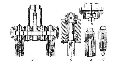 На рисунку 11.7 зображені конструктивні схеми вузлів багатошпиндельних головок з вальницями ковзання та кульковими підп'ятниками (рисунок 11.7, а); з вальницями кочення (рисунок 11.7, б); вузлів рушія вала головки за допомогою торцевої шпонки з її фланцевим кріпленням (рис. 10.7, в); кріплення інструмента з перехідною втулкою (рис. 10.7, г) та цангою (рис. 10.7, д).