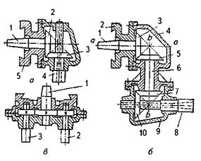Значного підвищення продуктивності праці на універсальних фрезерних верстатах досягають за допомогою спорядження їх спеціальними багатошпиндельними головками, які закріплюють до корпуса шпиндельної бабки. Вони, як і головки для свердлильних верстатів, отримують рух від шпинделя верстата, але відрізняються більшою жорсткістю, міцністю та можуть бути встановлені разом з багатомісними пристроями як на горизонтально-, так і на вертикально-фрезерних верстатах. Розглянемо схему обертової головки для горизонтально-фрезерного верстата (рисунок 11.8, а). Корпус 5 головки закріплено у вертикальних напрямних станини за допомогою клинового механізму. Обертовий рух від шпинделя верстата до шпинделя 4 головки передається через хвостовик 1 та конічні зубчасті колеса 2 і 3. Для встановлення головки під заданим кутом до горизонтальної площини її обладнують кутовою шкалою, нанесеною на поверхню а. Інша схема шпиндельної головки для горизонтально-фрезерного верстата зображена на рис. 10.8, б. Головка містить нерухомий корпус 2, проміжні обертові частини 4 та 9, що можуть обертатися навколо осей а-а та b-b відповідно. Робочий шпиндель 8 розташовано у частині 9. Рух від шпинделя верстата передається за допомогою хвостовика 1 валика б і зубчастих коліс 3-5 та 7-10. Обертання окремих частин головки навколо двох осей забезпечує встановлення робочого шпинделя головки під будь-яким