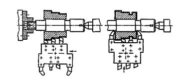 Токарні верстати часто споряджають спеціальними обертовими різце-держаками, що дають змогу закріплювати у них різальні інструменти (рисунок 11.9). Завдяки їм, використовуючи повздовжнє та поперечне подавання супорта верстата, можна одночасно обробляти декілька поверхонь. Для цього оброблювальний верстат налагоджують на роботу з упорами. В умовах серійного виробництва застосовують змінні різцедержаки однакового призначення, що дає змогу загострювати різці та налагоджувати їх на задані розміри поза верстатом, не перериваючи процес оброблення. Значну частину допоміжних пристроїв для закріплення різальних і контрольно-вимірювальних інструментів на токарних верстатах уніфіковано чи стандартизовано, їх основні параметри наведені у стандартах і довідковій літературі.